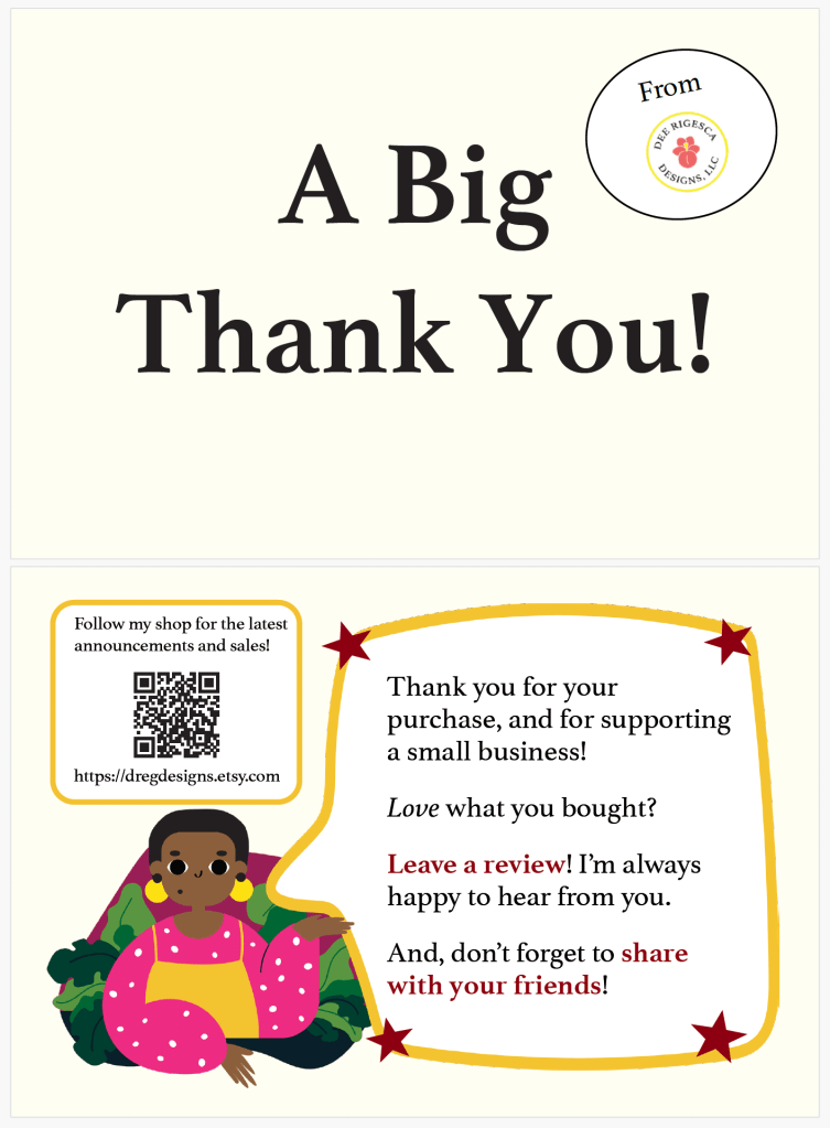 Back of a card I made for my small book business, which is now on Etsy.